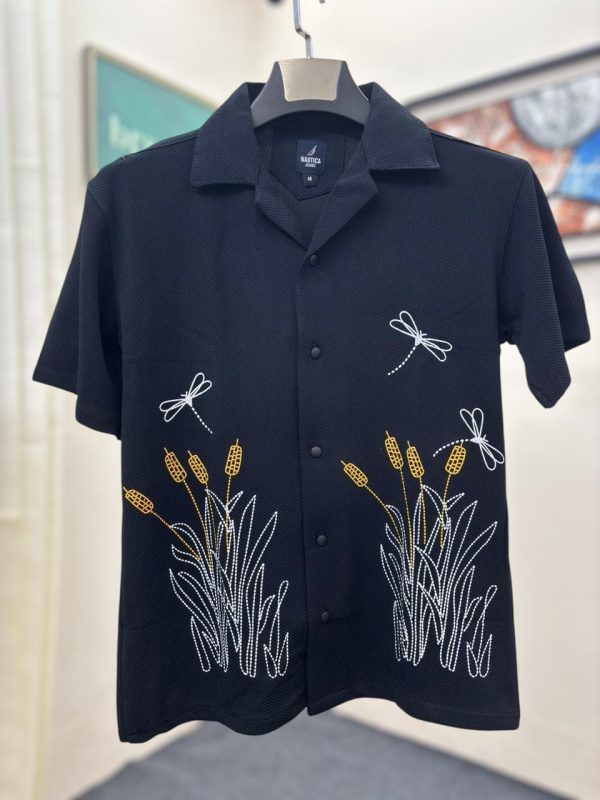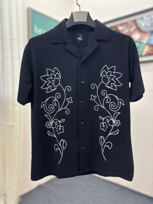 Flower Embroidery Full Shirt Black
